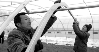 2月27日,黑龙江虎林市杨岗镇的农民正在搭建隔寒增温水稻育苗大棚,备战春播。近年来,虎林市农业部门利用自主研发的水稻育苗隔寒增温新技术,大大增加了水稻产量。 本报记者 李树贵摄