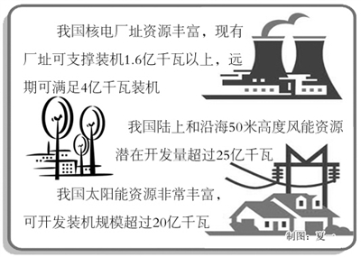 据专家分析,我国核电厂址资源丰富,现有厂址可支撑装机1.6亿千瓦以上,经过进一步勘查选址,远期可满足4亿千瓦装机。我国陆上和沿海50米高度风能资源潜在开发量超过25亿千瓦,主要分布在“三北”(东北、西北、华北)和东部沿海地区;我国太阳能资源非常丰富,主要分布在西藏、青海、新疆、甘肃、内蒙古等省区,可开发装机规模超过20亿千瓦。