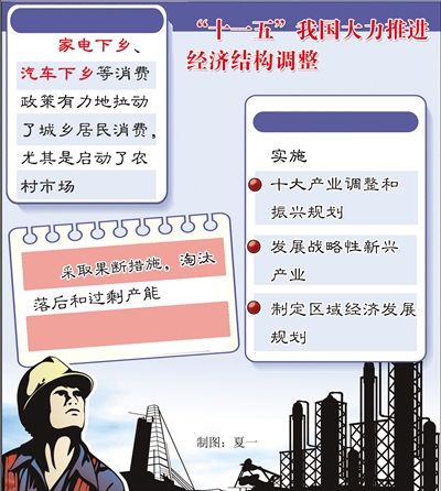 “十一五”时期,经济结构调整取得的积极进展,得益于5年来我国始终坚持大力推进经济结构调整;通过家电下乡、汽车下乡等消费政策有力地拉动了城乡居民消费,尤其是启动了农村市场;淘汰落后和过剩产能;实施10大产业调整和振兴规划、发展战略性新兴产业,制定区域经济发展规划……