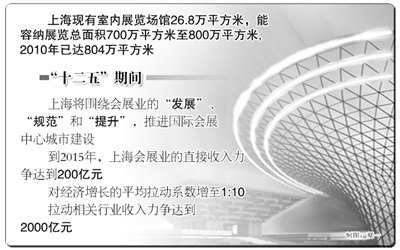 此外,上海市会展业要做好效益,到2015年,上海市会展业的直接收入力争从2009年的116亿元增至2015年的200亿元,对经济增长的平均拉动系数从2009年的1∶9.2,增至2015年的1∶10,拉动相关行业收入力争从2009年的1000亿元达到2015年的2000亿元。