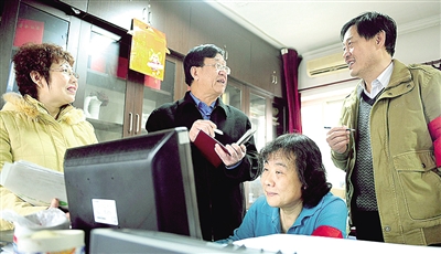 全国人大代表、北京市东城区环卫服务中心退休职工关阔山(左二)会前到北京东城区永外街道革新里社区调研。