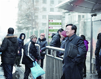 关阔山代表(右一)冒雪在公交车站候车,准备去同团代表家中推敲将要提交的议案。