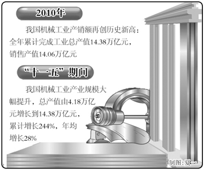 统计数据显示,“十一五”期间,我国机械工业产业规模大幅提升,总产值由2005年的4.18万亿元,增长到2010年的14.38万亿元,累计增长244%,年均增长28%,比“十一五”规划的预期目标12%高出16个百分点。