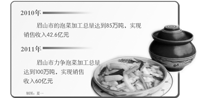 经过几年的努力,眉山市的泡菜产业走在前列。2010年全市的泡菜加工总量达到85万吨,比上年增长30.8%;实现销售收入42.6亿元,比上年增长42%;泡菜原料基地达到31.8万亩,带动14余万菜农增收近4亿元。由此,我们提出,2011年力争实现泡菜加工总量达到100万吨,泡菜销售收入达到60亿元的目标。