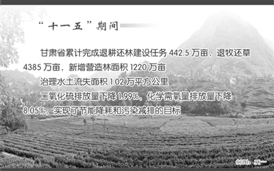 甘肃省是黄河和长江的重要水源补给区和生态功能区,生态地位极其重要。“十一五”期间,我们大规模推进生态环境保护与建设,石羊河流域重点治理阶段性目标如期实现,张掖和敦煌节水型社会建设试点取得重大进展,甘南黄河重要水源补给区生态保护与建设稳步推进,天然林保护、退耕还林、退牧还草、“三北四期”等重大生态项目成效显著。全省累计完成国家下达的退耕还林建设任务442.5万亩,退牧还草4385万亩,新增营造林面积1220万亩;治理水土流失面积1.02万平方公里;二氧化硫排放量下降1.99%,化学需氧量排放量下降8.05%,实现了节能降耗和污染减排的目标。“十二五”时期,我们将坚定不移地按照科学发展观的要求,紧紧围绕建设生态文明省的奋斗目标,切实加强生态建设和环境保护,全面推进资源节约型和环境友好型社会建设,大力发展循环经济,提高可持续发展能力。