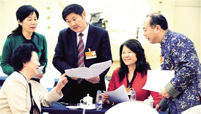 3月5日下午,人大河南代表团在驻地举行全体会议,审议政府工作报告。休息时,该团的周森代表(右一)、霍金花代表(右二)、刘国庆代表(右三)、李其宏代表(左一)、刘志华代表(左前)在一起畅谈感受。 本报记者 李景录摄