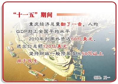 “十一五”期间,重庆市深入贯彻落实科学发展观,经济社会发展实现重大跨越。全市经济总量5年翻了一番,2010年增速跃居中西部第一。人均GDP赶上全国平均水平,为在西部地区率先实现全面小康奠定了基础。