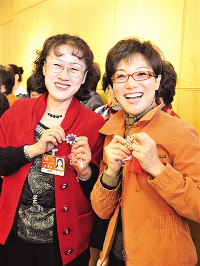 3月7日上午,出席全国政协十一届四次会议的妇联界委员驻地一片欢声笑语。在小组讨论结束后,大家收到了一位委员设计的工艺胸花,格外高兴。 本报记者 赵 晶摄