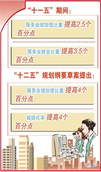 “十二五”规划纲要草案提出,把推动服务业大发展作为产业结构优化升级的战略重点,营造有利于服务业发展的政策和体制环境,拓展新领域,发展新业态,培育新热点,推进服务业规模化、品牌化、网络化经营,不断提高服务业比重和水平。