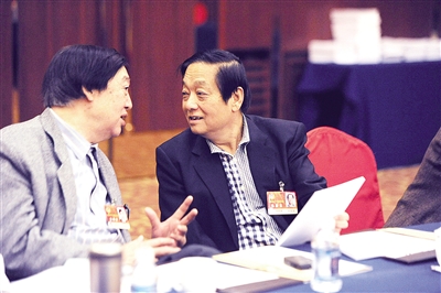在全国政协十一届四次会议的文艺界委员小组讨论时,韩美林委员(右)和冯骥才委员一起畅谈政协委员在非物质文化遗产的保护方面所发挥的积极作用。 本报记者 赵 晶摄