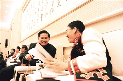 3月7日下午,人大海南代表团在人民大会堂举行全体会议,继续审议政府工作报告。陈国诚代表(右)与同团的王雄代表对报告中深化合作、建设中华民族共同家园的论述备感振奋。 本报记者 李景录摄