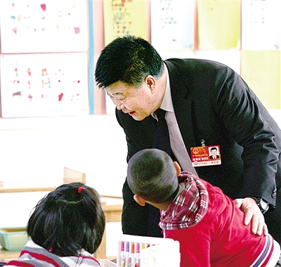 人大辽宁代表团的韩召善代表利用休息时间来到北京第四幼儿园,就“入托难”等民生问题深入调研。 本报记者 苏大鹏摄