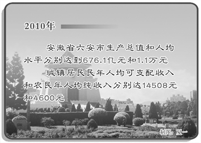 “十一五”期间,安徽省六安市人民生活水平显著提高,社会事业全面进步。2010年,全市生产总值和人均水平分别达到676.1亿元和1.1万元;财政收入增至68.6亿元,城镇居民年人均可支配收入和农民年人均纯收入分别达14508元和4600元。