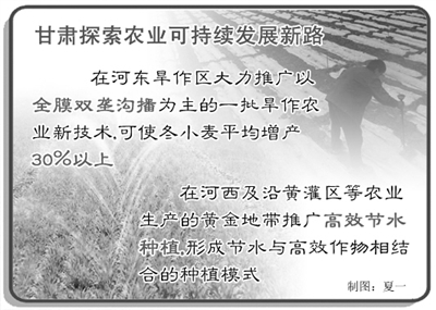 陆浩代表告诉记者,甘肃省在河东旱作区大力推广全膜双垄沟播技术的同时,在河西及沿黄灌区等农业生产的黄金地带推广高效节水技术,探索出节水与高效作物相结合的种植模式,走出了一条可持续发展的新路子。