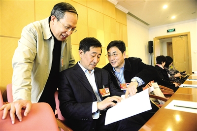 3月11日上午,出席全国政协十一届四次会议的委员们进行分组讨论。全总界陈永满(左)、于天忱(中)、宋学斌3位委员都来自国有企业,小组讨论开始前,他们就进一步深化国企改革充分交换意见。 本报记者 赵 晶摄
