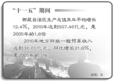 “十一五”时期是西藏发展进程中极不寻常、砥砺奋进的五年。五年来,西藏坚持走有中国特色、西藏特点的发展路子,大力实施“一产上水平、二产抓重点、三产大发展”的经济发展战略,牢牢把握推进跨越式发展和长治久安这个主题,坚定不移抓发展,尽心竭力惠民生,经济社会发展亮点纷呈。