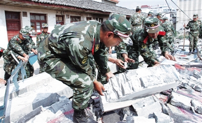 3月12日,武警云南总队官兵在云南省盈江县地震灾区拆除危房。当日,武警云南总队官兵在云南省德宏州盈江县城和周边救灾点,帮助受灾群众拆除危房。 郝亚鑫摄(新华社发)