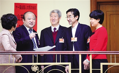 3月11日上午,人大山东代表团审议全国人大常委会工作报告。该团张淑琴、张少军、赵志全、尹传贵、刘建文5位代表(从左至右)有一个共同的感受,报告对人大的依法监督功能表述得准确到位,体现得非常充分。 本报记者 李景录摄
