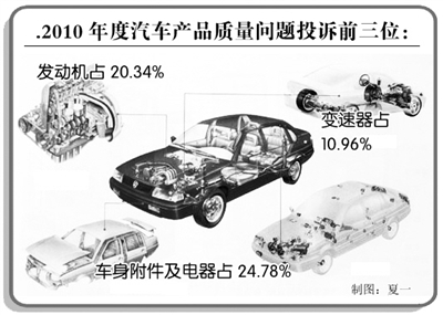 第一,投诉数量与去年同期相比增长20%,分析表明,每年2月下旬起,日投诉量就呈明显上升趋势,至“3·15”前夕,投诉量会出现小高峰,说明“3·15”已成为消费者维权的重要时期;第二,综合性投诉增加,原因在于针对质量问题维修时,常引发服务问题,如服务态度差、维修效率低、更换配件久等投诉;第三,质量问题投诉中,车身附件及电器问题占比最高,其次是发动机故障,相比2010年同期,发动机、车身附件的投诉分别增加5%和3.5%,说明车主对发动机等重要部件关注度依然很高,且对驾乘的舒适度提出更高要求;第四,服务投诉中,由更换配件引发的纠纷最多,其次是服务态度。究其原因,主要表现在更换配件不及时、服务站态度冷漠、拖延解决等方面,说明厂家及服务商在配件调拨、更换效率及服务态度上还需提高;第五,分析用户投诉要求显示,“把车修好”仍是关键,占比近7成;其次是要求赔偿多次往返维修站的交通费、误工费等,此外车主已开始提出延长车辆或部件的免费保修期等更加深入的细节要求,可见车主在维权方面越来越细致和深入。