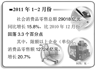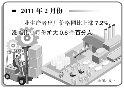以上两个因素影响的直接体现就是工业生产者价格指数的不断上涨。去年底到今年以来,工业生产者出厂价格环比连续上涨,2月环比上涨0.8%;同比价格涨幅也逐月扩大,1月份,工业生产者出厂价格比去年同月上涨6.6%,涨幅比上月扩大0.7个百分点;2月份,工业生产者出厂价格上涨7.2%,涨幅比上月扩大0.6个百分点。国际大宗商品价格普遍走强,上游产品价格上涨已经开始逐步传导到下游,并带动下游产品价格走高。加上多数地区上调最低工资标准,原材料价格上涨和人工费用上升,增加了企业的生产成本,从而推动工业生产者出厂价格不断上涨。这些都对消费品价格上涨形成了巨大的压力。