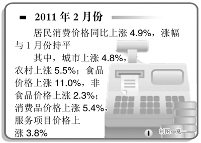 国家统计局3月11日发布的统计数据显示,2月份,居民消费价格指数同比上涨4.9%,环比上涨1.2%。国家统计局新闻发言人盛来运认为,2月份CPI涨幅较高的主要原因是翘尾因素和季节性因素,但从全年来看,既存在物价上涨的压力,也存在价格下降的有利条件,全年物价将保持基本稳定。