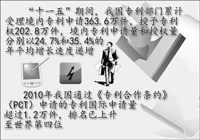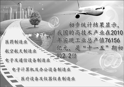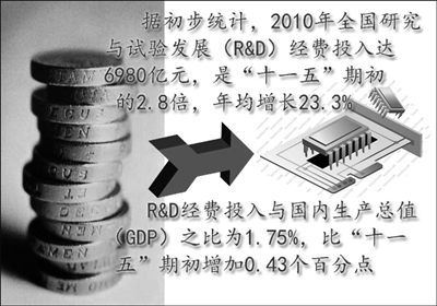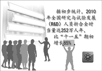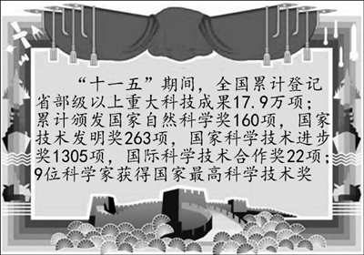 “十一五”期间,我国科技人力资源总量、研究与开发人员数跃居世界第1位,高技术产业产品出口额跃居世界第1位,高技术产业增加值跃居世界第2位,国际科技论文数跃居世界第2位,本国人发明专利授权量跃居世界第3位,中国PCT国际专利申请量跃居世界第4位,研究与开发经费跃居世界第3位。