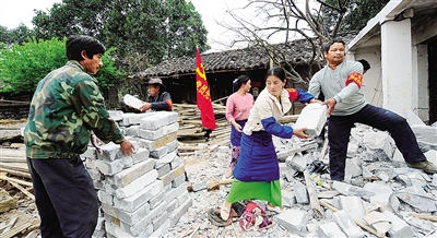 3月16日,盈江县平原镇基层党员在拉勐寨抢险排危,清理砖瓦。 云南盈江地震发生后,灾区760个基层党组织、1万多名党员干部迅速集结,投入到抗震救灾一线。 新华社记者 秦 晴摄
