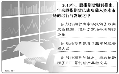 2010年,股指期货顺利推出。一年来,市场总体运行平稳,监管严格,市场交易较为活跃,期现价格联动性较好,市场功能得到初步发挥,实现了股指期货平稳起步、安全运行的预期目标,股指期货成功融入资本市场的运行与发展之中。