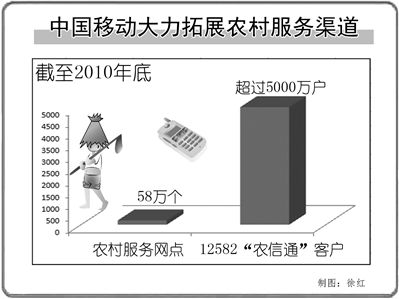村村通移动电话只是中国移动大力推进农业信息化的第一步。针对农村客户消费特点,中国移动为农民提供了基于区域优惠的“神州行”家园卡等资费产品和基于群体优惠的“惠农网”等资费产品,为农民带来资费实惠。为方便农民办理业务,中国移动大力拓展农村服务渠道,截至2010年底,中国移动农村服务网点数达到58万个。中国移动还创造性地推广“空中充值”服务,采用电子充值的业务办理方式有效解决了农村服务缴费难的问题。