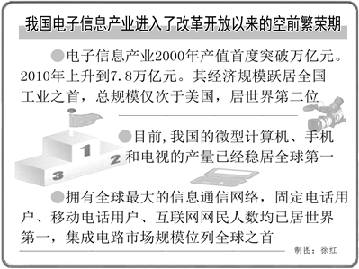 “十一五”期间,我国信息产业服务经济社会发展和信息化建设的能力显著增强。随着“十五”计划的全面完成以及“十一五”规划的深入开展,电子信息产业规模已经位居世界前列,信息产业增加值占GDP的比重在“十一五”期间提高了2.2个百分点。此外,在信息化推进等方面也取得重大进展。2010年我国的信息产业产值完成7.8万亿元。国家关于加强宏观调控、优先发展高新技术产业和现代服务业的举措明显促进了信息产业的发展。