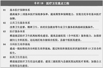 完善重大疾病防控等专业公共卫生服务网络。逐步提高人均基本公共卫生服务经费标准,扩大国家基本公共卫生服务项目,实施重大公共卫生服务专项,积极预防重大传染病、慢性病、职业病、地方病和精神疾病,提高重大突发公共卫生事件处置能力。逐步建立农村医疗急救网络。普及健康教育,实施国民健康行动计划。全面推行公共场所禁烟。70%以上的城乡居民建立电子健康档案。孕产妇死亡率降到22/10万,婴儿死亡率降到12‰。