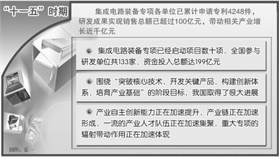 “十一五”时期,集成电路装备专项已经启动项目数十项,参与研发单位共133家,资金投入总额达199亿元;围绕突破核心技术,开发关键产品,构建创新体系,培育产业基础的阶段目标,我国取得了很大进展。产业自主创新能力正在加速提升,产业链正在加速形成,一流的产业人才队伍正在加速集聚,重大专项的辐射带动作用正在加速体现。