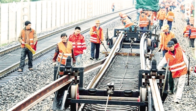 3月18日,鹰潭工务机械段施工人员在京九铁路孔垄至九江区段更换700米长轨。当日,京九铁路南昌局段开始全面进行集中大修。这是京九铁路自1996年开通以来南昌局段线路进行首次集中大修。 胡国林摄(新华社发)