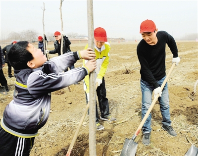 3月19日,一位小朋友和邻居一起参加义务植树活动。当日,山东省济南市近万人参加义务植树活动,植树面积达百余亩。自1981年全民开展义务植树活动以来,山东省共有10多亿人次参加义务植树,完成义务植树36亿株。 新华社记者 范长国摄