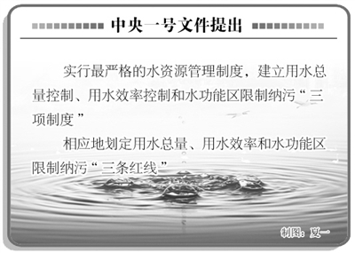 今年的中央一号文件明确提出,实行最严格的水资源管理制度,建立用水总量控制、用水效率控制和水功能区限制纳污“三项制度”,相应地划定用水总量、用水效率和水功能区限制纳污“三条红线”。