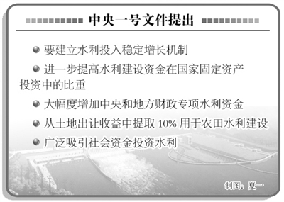 今年中央一号文件提出,要建立水利投入稳定增长机制,进一步提高水利建设资金在国家固定资产投资中的比重,大幅度增加中央和地方财政专项水利资金,从土地出让收益中提取10%用于农田水利建设,广泛吸引社会资金投资水利。