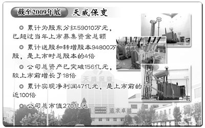 10年来,天威保变坚持“双主业”发展战略,实现了超常规跨越式发展。截至2009年底,天威保变累计为股东分红59010万元,已超过当年上市募集资金总额;累计送股和转增股本94800万股,是上市时总股本的4倍;公司总资产已突破156亿元,较上市前增长了18倍;累计实现净利润47亿元,是上市前的近100倍;公司总市值270亿元,排在上交所近千家上市公司的112位,已成为真正的大盘蓝筹绩优股。