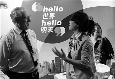 3月12日,在第16届中国国际教育巡回展上,工作人员在相互交流。 当日,第16届中国国际教育巡回展的第一站在北京国贸展厅开幕,来自30多个国家和地区的400多所高校和教育机构参展。教育巡回展之后还将在上海、广州等城市举办。 罗 伟摄 (新华社发)