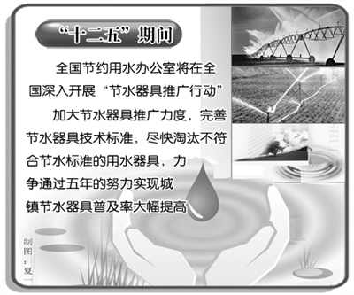 本报北京3月21日讯 记者张雪报道:3月22日是第19届“世界水日”,联合国确定的宣传主题为“城市用水:应对都市化挑战”,我国的宣传主题为“严格管理水资源,推进水利新跨越”。为唤起全社会节约保护水资源的意识,有效应对都市化发展带来的用水挑战,水利部、全国节约用水办公室21日在北京市怀柔区全面启动了“十二五”节水器具推广行动,未来五年我国将加大节水器具推广工作力度,优先对低收入群体家庭进行换装改造,采用赠送和补贴等方式引导居民安装使用节水器具。