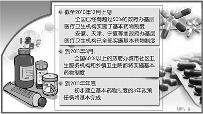 到2011年3月,全国60%以上的政府办城市社区卫生服务机构和乡镇卫生院都将实施基本药物制度。到2011年年底,初步建立基本药物制度的3年政策任务将基本完成。