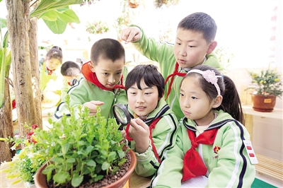 3月22日,北京东四九条小学的学生们,在阳光植物生态园内做实验。 在世界气象日到来之际,该校设立多个实践基地,培养学生动手能力,激发学生学科学、爱科学的热情。 本报记者 赵 晶摄