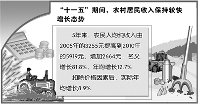 5年来,农民人均纯收入由2005年的3255元提高到2010年的5919元,增加2664元,名义增长81.8%,年均增长12.7%;扣除价格因素后,实际年均增长8.9%。比“十五”期间农村居民收入年均实际增长速度高3.6个百分点。2010年农村居民收入增速多年来首次高于城镇居民,城镇居民人均可支配收入和农村居民人均纯收入名义增速分别为11.3%和14.9%,实际增速分别为7.8%和10.9%,农村居民收入增速比城镇居民分别高3.6个百分点和3.1个百分点。