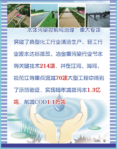 在主要污染物减排技术方面,水专项突破了典型化工行业清洁生产、轻工行业废水达标排放、冶金重污染行业节水等关键技术214项,并在辽河、海河、松花江等重点流域70项大型工程中得到了示范验证,实现每年减排污水1.3亿吨,削减COD1.1万吨。