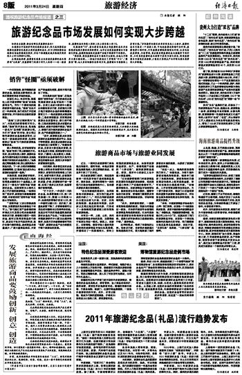 “现阶段,我国旅游纪念品市场还不太规范,各地几乎都是小商小贩在做。一些地方虽然成立了所谓的‘中心’、‘聚集园’等,也大多采取摊位出租的方式,旅游商品市场整体上发育欠佳。”多位接受本报记者采访的业内人士表示,旅游纪念品市场是一个系统工程,它包括旅游者购物行为研究、旅游消费心理研究、不同旅游者群体购物倾向研究,以及包括批发零售、市场管理、售后服务等旅游纪念品流通环节的研究,只有坚持旅游纪念品经营开发的市场化原则,尊重旅游商品市场的发展规律,才能真正实现从产品研制向商品消费的大步跨越。