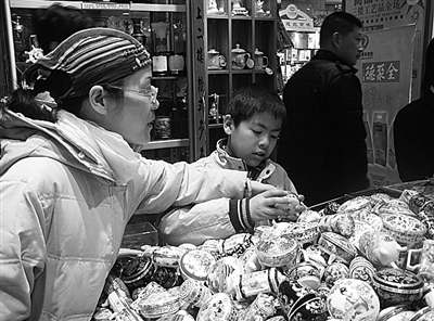 上图 在北京王府井大街一家专营旅游纪念品的店里,顾客正在挑选10元一个的景泰蓝小首饰盒。