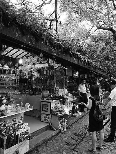 右图 在福建武夷山某景区旅游商店,几位游客正在挑选旅游纪念品。遗憾的是在琳琅满目的旅游商品中,真正富有当地特色的旅游纪念品却难以寻觅。