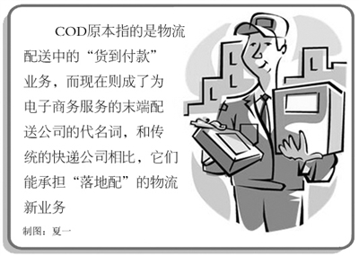 什么是COD?它原本指的是物流配送中的“货到付款”业务,而现在则成了为电子商务服务的末端配送公司的代名词,和传统的快递公司相比,它们能承担“落地配”的物流新业务,即承接起B2C企业在某个城市或区域的货物配送、退换、收账、退还货款的一整套服务。