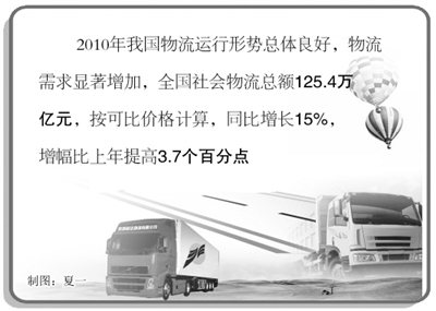 本报讯 记者杨国民报道:国家发改委、国家统计局、中国物流与采购联合会日前联合发布的“2010年全国物流运行情况通报”显示,2010年我国物流运行形势总体良好,物流需求显著增加,全国社会物流总额125.4万亿元,按可比价格计算,同比增长15%,增幅比上年提高3.7个百分点。物流运行效率有所提高,物流业增加值快速增长,为保证国民经济平稳较快发展发挥了重要的支撑保障作用。
