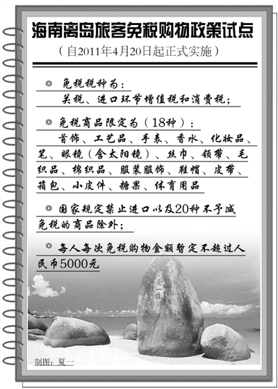 本报北京3月24日讯 记者孙勇 何伟、实习生李红波报道:财政部今日对外发布关于开展海南离岛旅客免税购物政策试点的公告,明确试点自2011年4月20日起正式实施,免税商品限定为首饰、工艺品、手表等18种进口商品,每人每次免税购物金额暂定不超过人民币5000元。