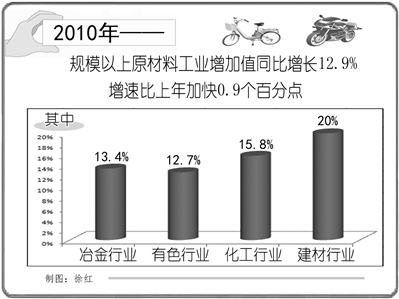 对此,工信部相关负责人表示,这一方面是因为我国工业化、城镇化加快推进和实施,以及应对国际金融危机一揽子计划的出台,对原材料工业拉动作用明显;另一方面,针对2010年年初高耗能行业产能过快释放和节能减排的压力加大等问题,国家及时加大了宏观调控力度,原材料工业结构调整、节能减排取得积极进展,确保了生产实现平稳增长。